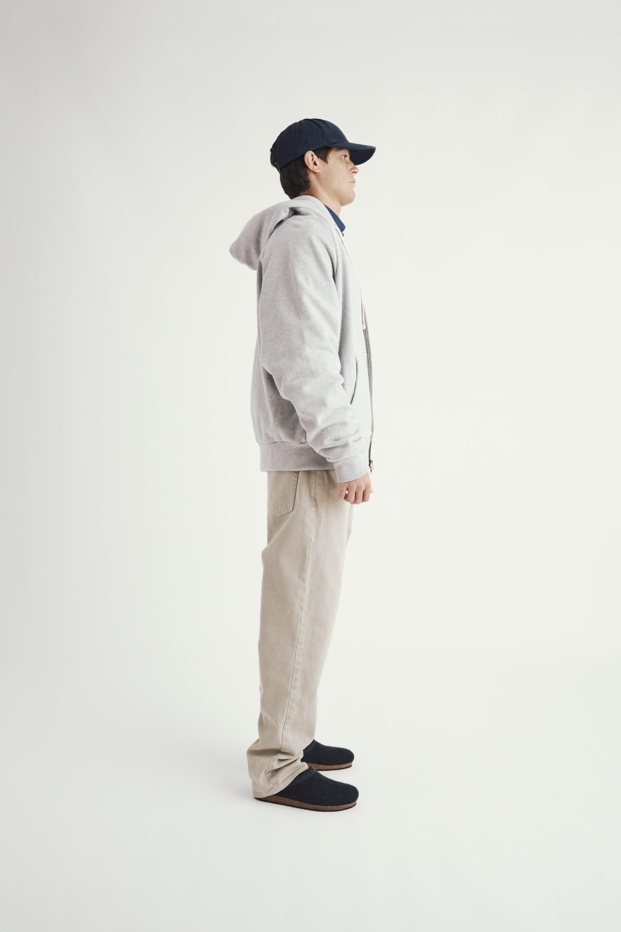 We finish the piece with a classic high-shine YKK metal double zip — a detail chosen for longevity and a clean, elevated look. The exterior fleece is peached on the face side, creating a uniquely soft handfeel that contrasts with its super-heavyweight build. The result is a hoodie that’s warm, durable, and comfortable from the first wear, and one that only gets better with time.