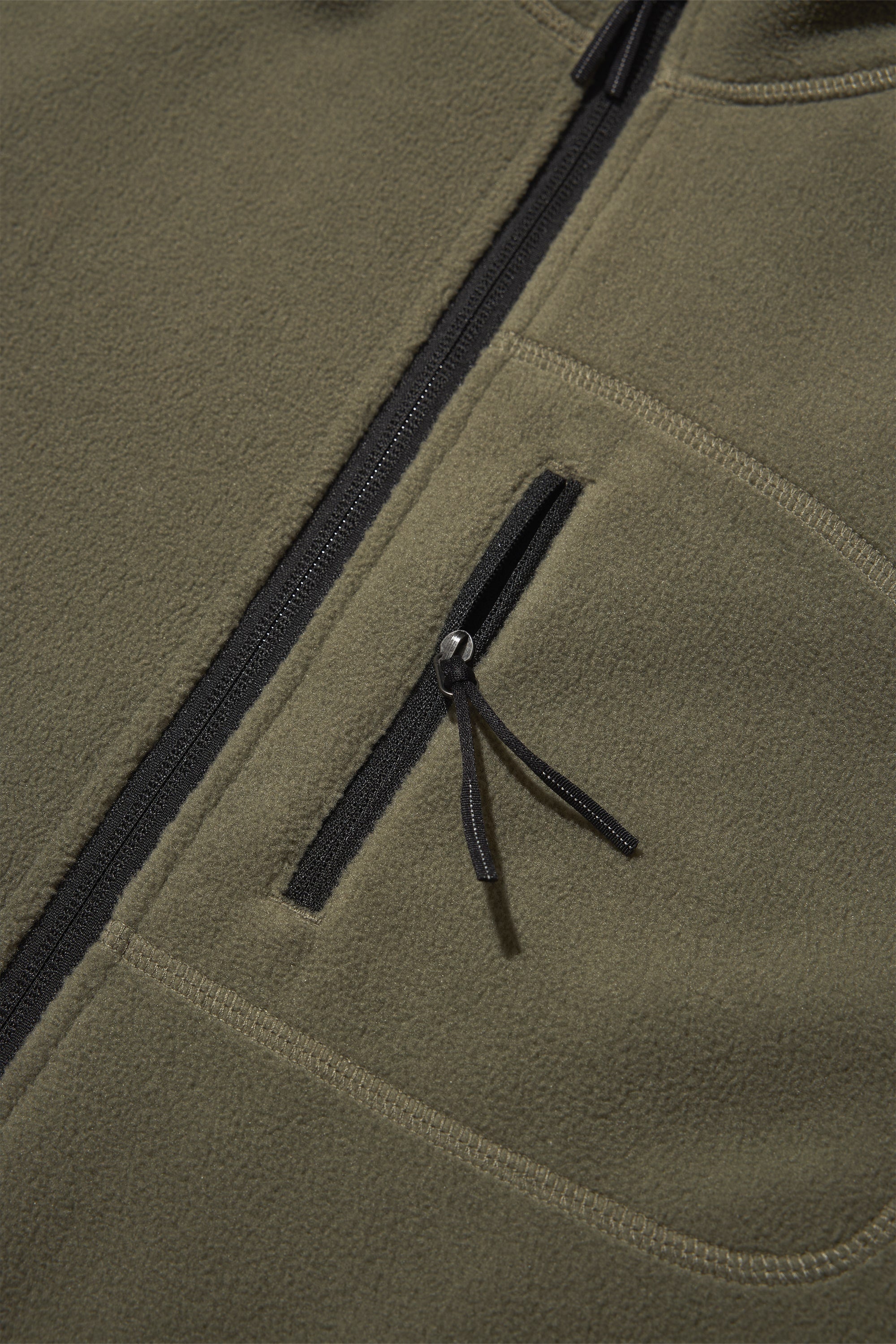 The body fabric is a mid-weight 275 GSM polyester fleece that is double-sided brushed for warmth and softness. The fleece quality can be washed and worn and will resist pilling while keeping its soft handfeel. It is substantial enough to serve as your everyday outer layer on clear winter days, and it also slides naturally under a shell when temperatures really drop. All zippers are reverse-coil YKK with antique silver heads, and contrast black tape has been used on both colorways. The easy-access, mesh-backed chest pocket features reflective fiber-woven pulls to help increase visibility during low-light commutes or evening runs. Every pocket has a zipper closure and is backed with heavy-duty mesh.