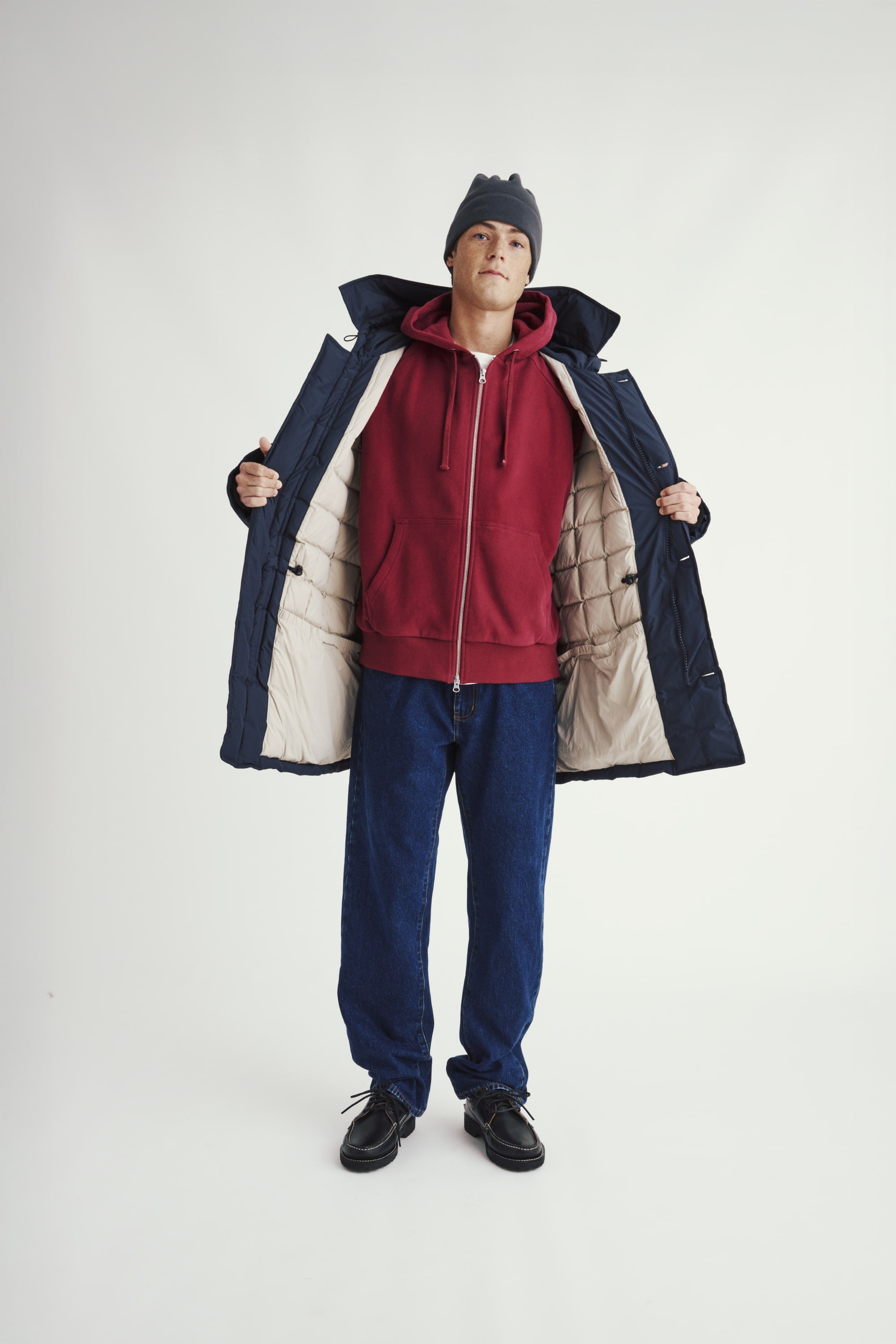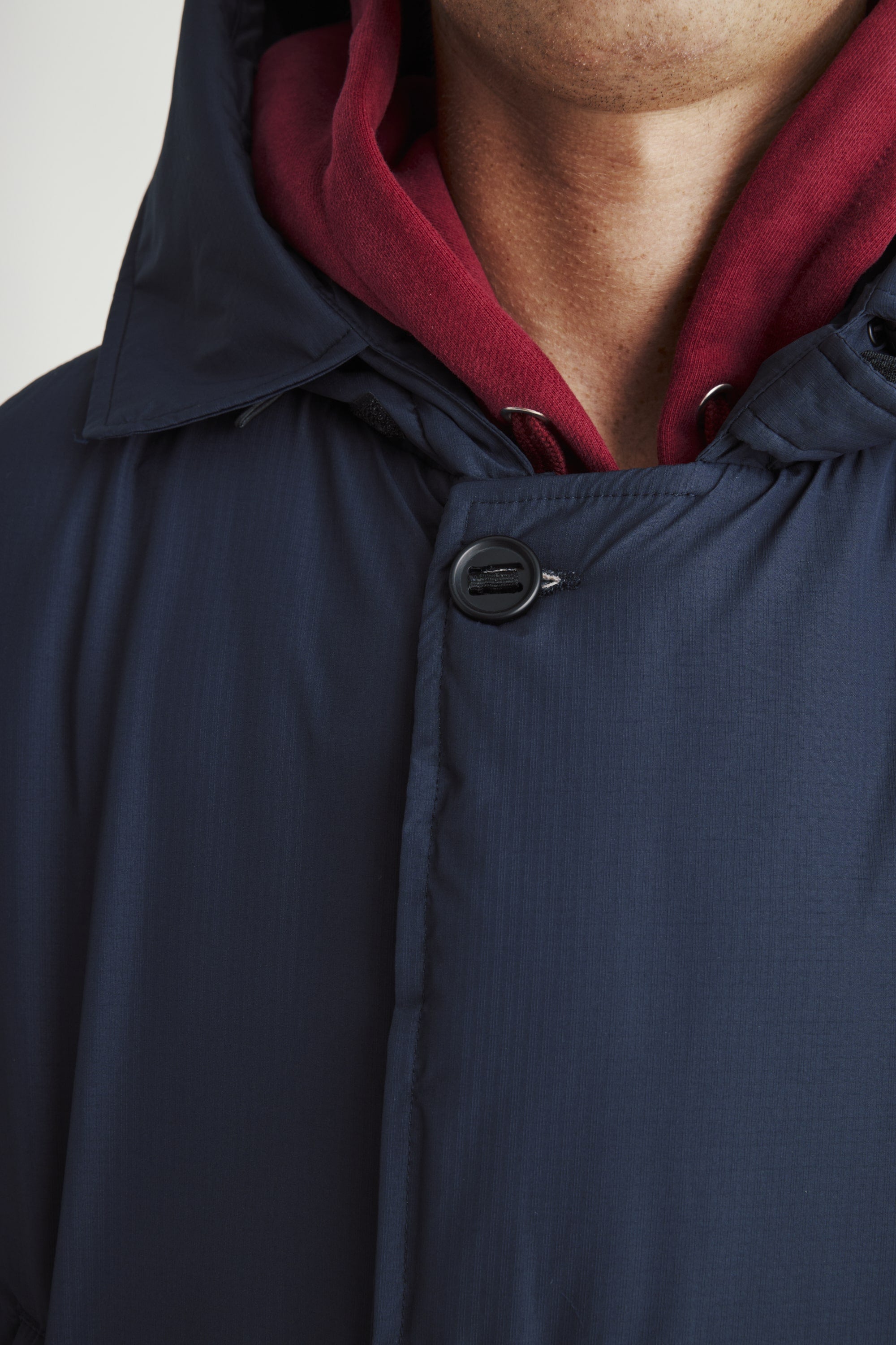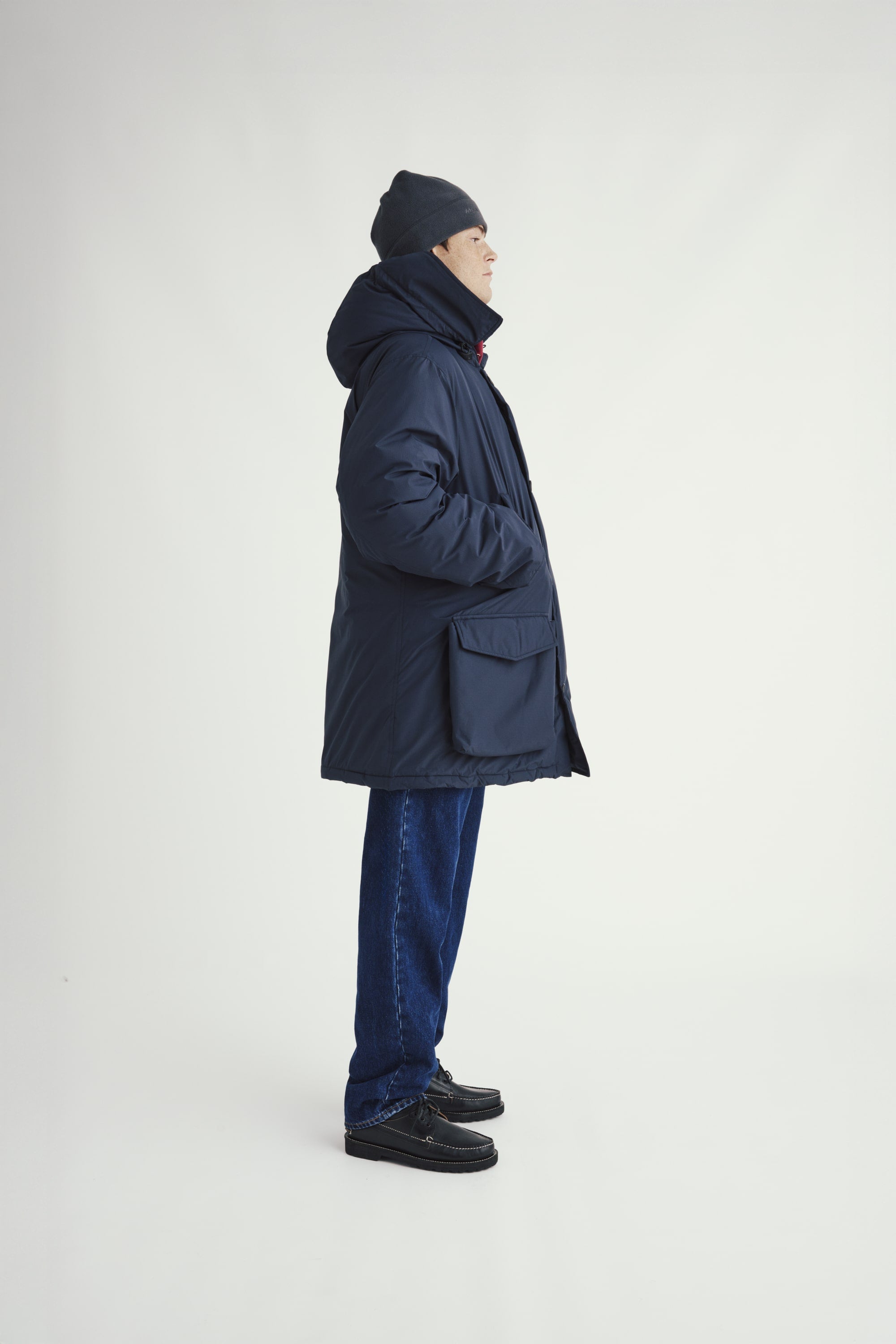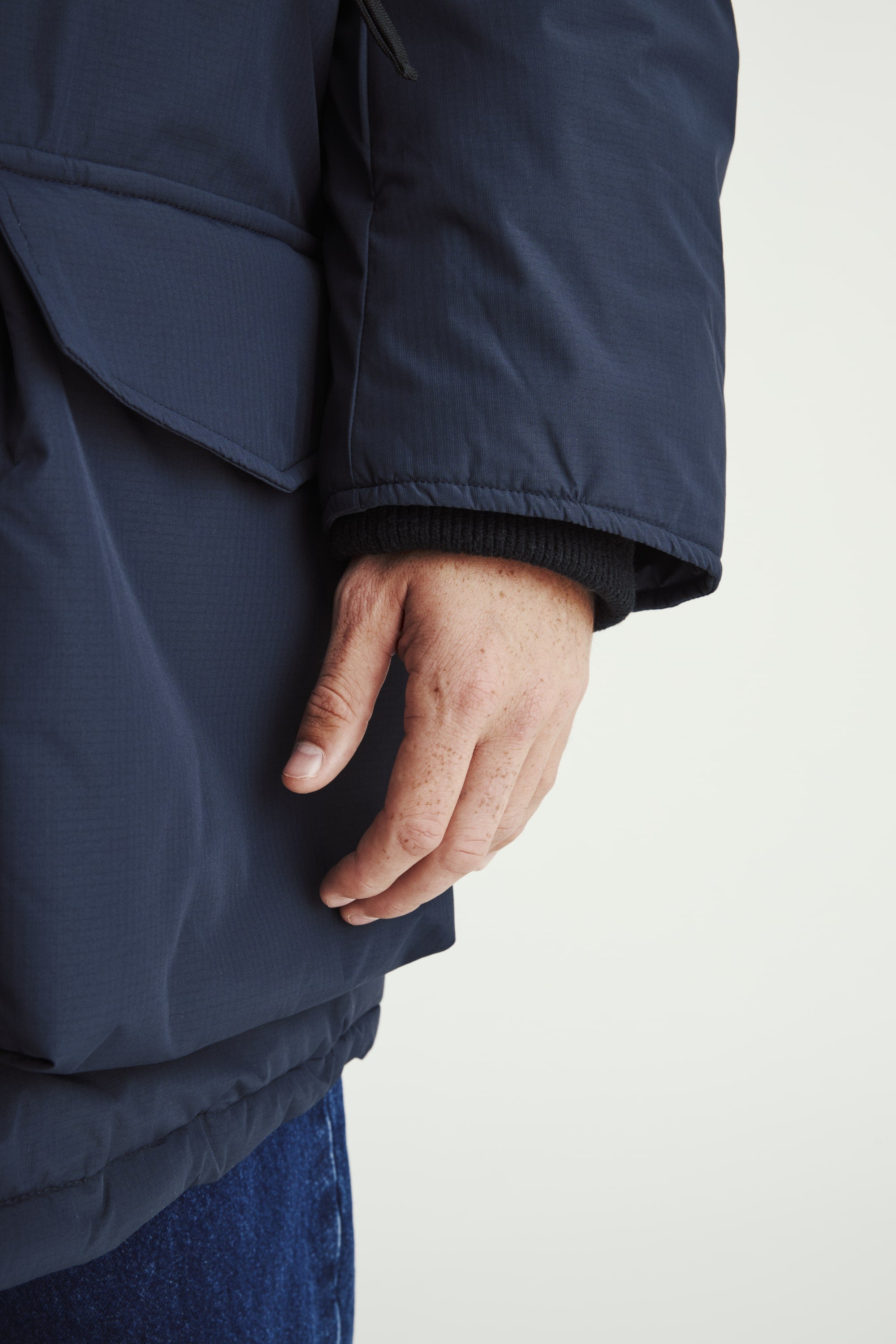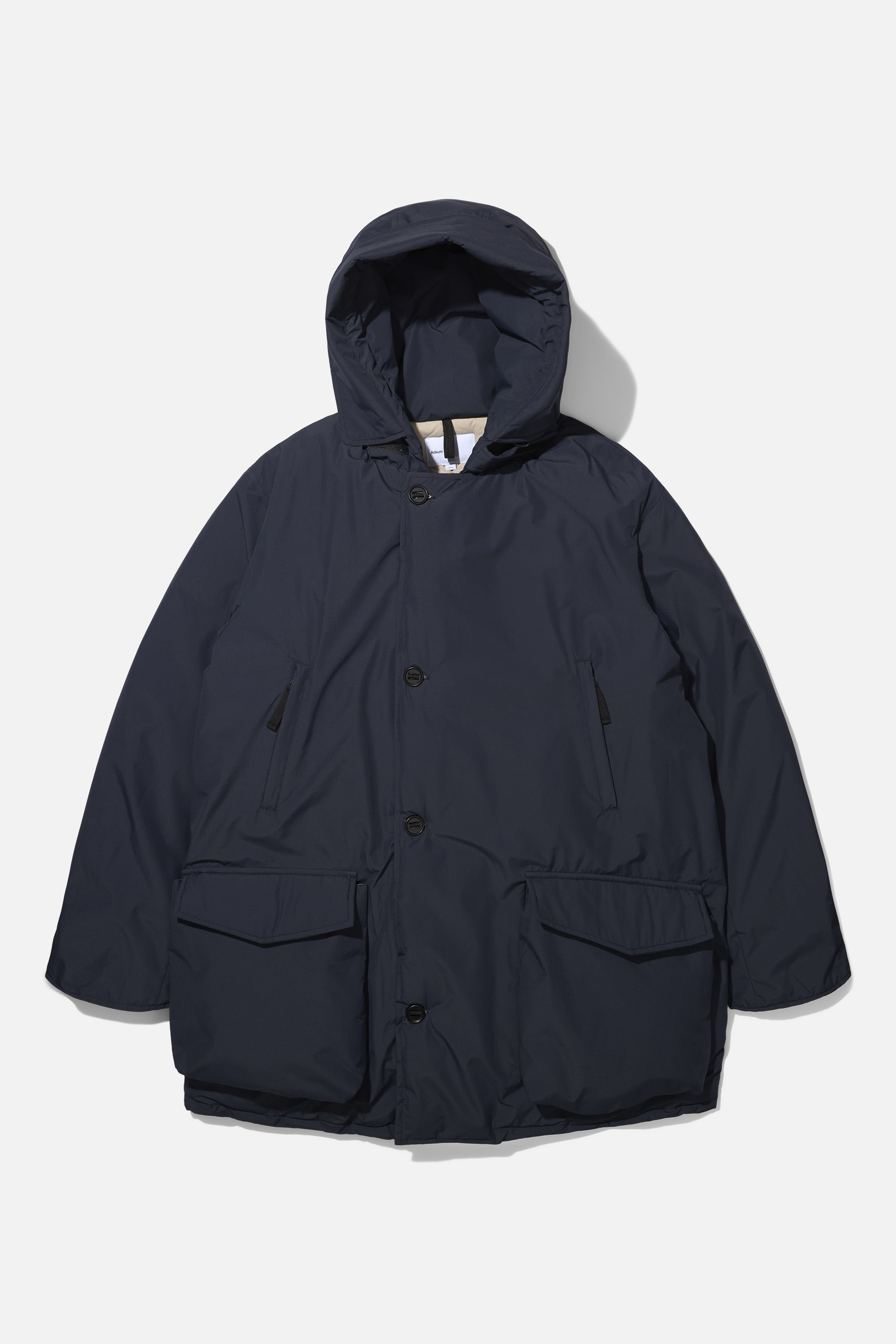 The Field Parka references down coat construction from the early stages of down outerwear that was pioneered in the US. Zippered hand warming pockets are located on the mid chest area and are lined with poly fleece. We made OG style sandwich bag pockets on the front of the jacket that have hidden side entry hand warming pockets. All buttons use a grosgrain attachment method that wears tougher than a regular four hole sew-on button.